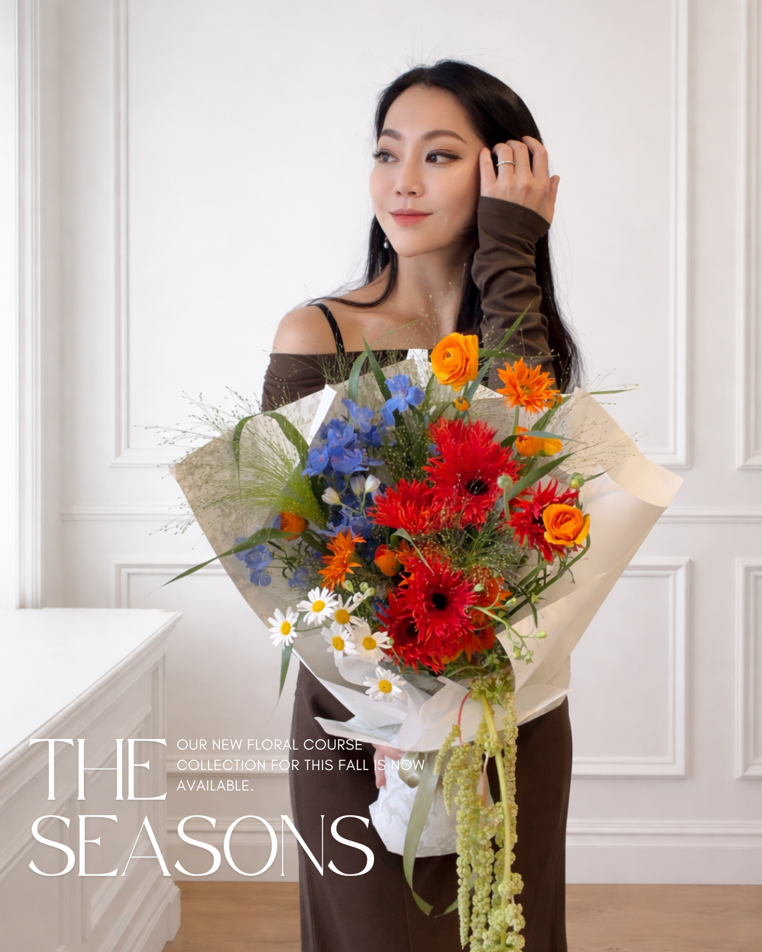 以明亮而自由的色彩為靈感,將紅、橘、藍與白色花材自然交織,像春日花園在陽光下同時綻放。花束保留了輕盈與野性的線條,讓每一朵花都在色彩中自由呼吸,垂墜的綠色雞冠營造藝術優雅感受,整體呈現充滿生命力與喜悅的繽紛氛圍 🌸✨