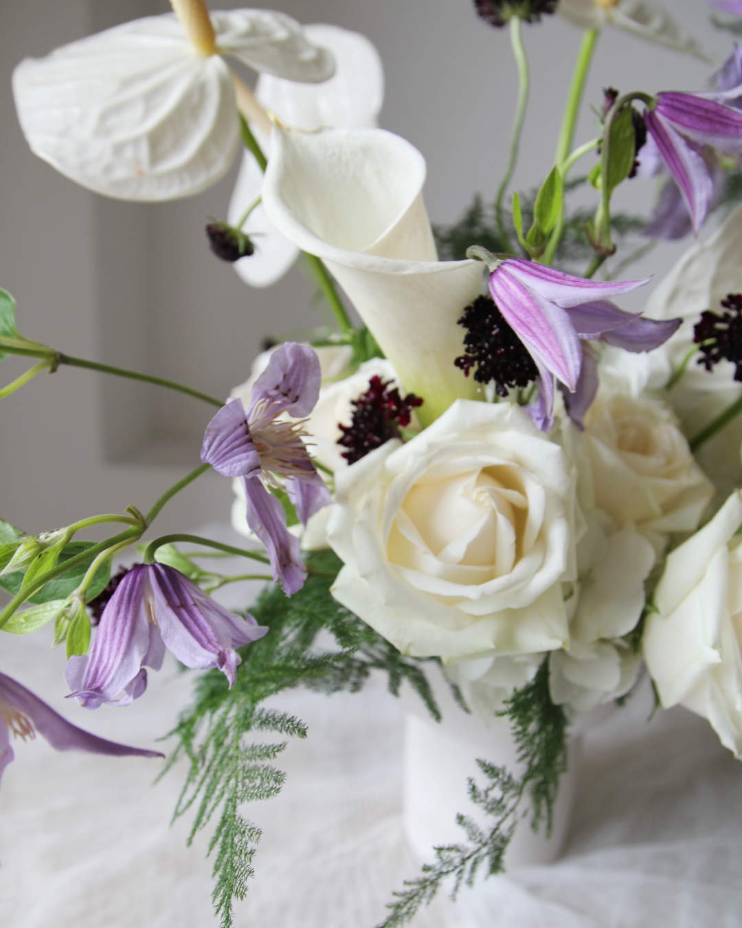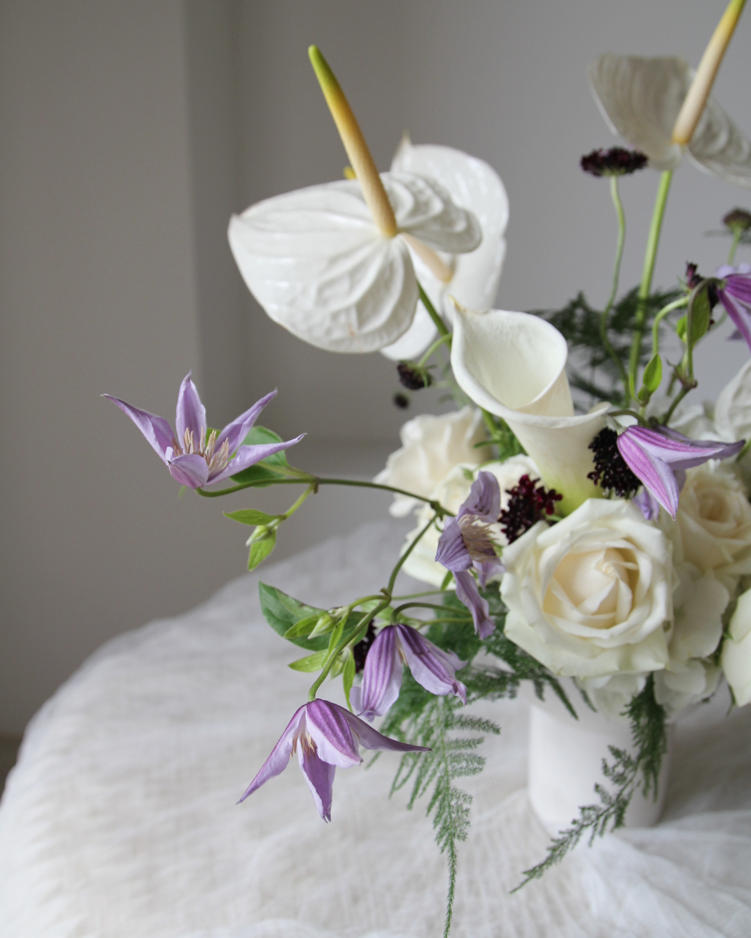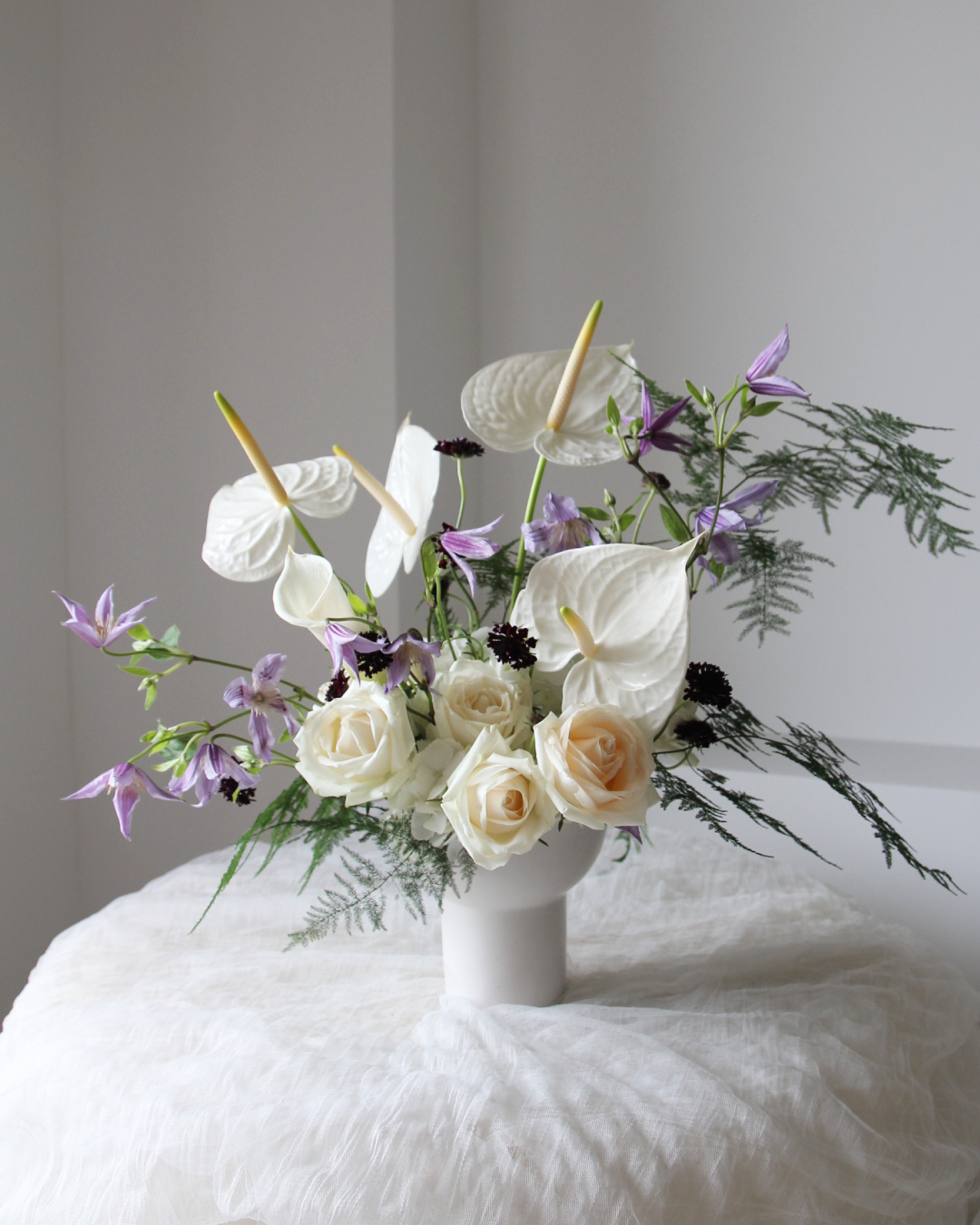 以純白奶油玫瑰與浪漫紫色鐵線蓮,訴說優雅與從容,羽葉鋪展,